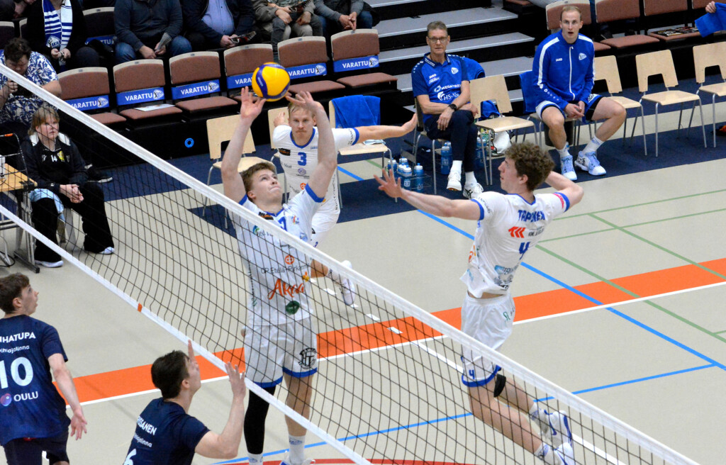 Akaa-Volleyn avainpelaajia Oulussa olivat passari Ville Kuukasjärvi, hakkuri Antti Ropponen (3) ja Antti Taponen (4).