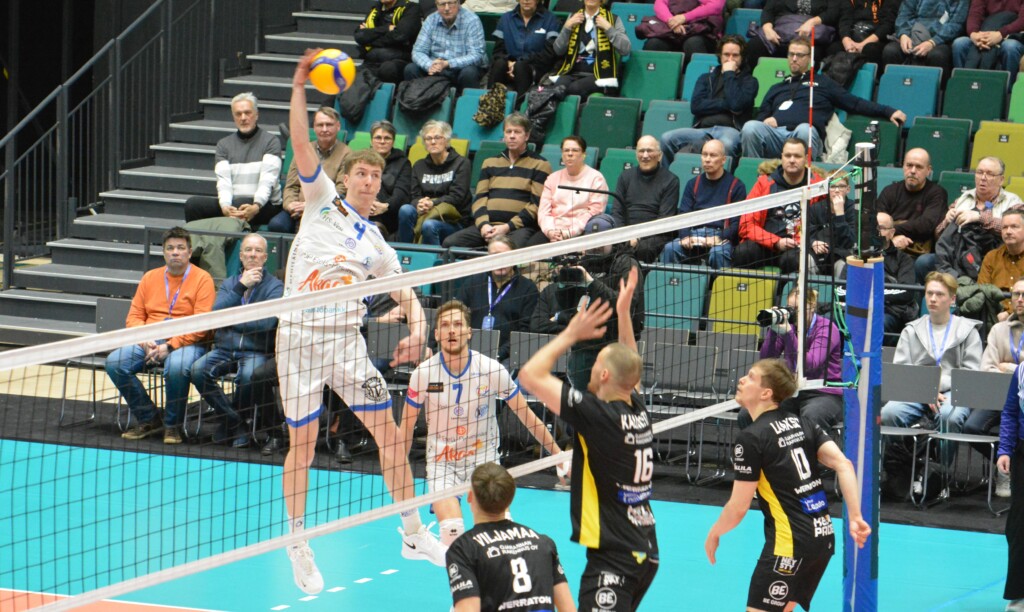 Antti Taponen palkittiin Turussa Akaa-Volleyn parhaana. Kuvassa keskipelaaja tekee yhden neljästä hyökkäyspisteestään. Torjuntapisteitä miehelle kertyi kaksi.