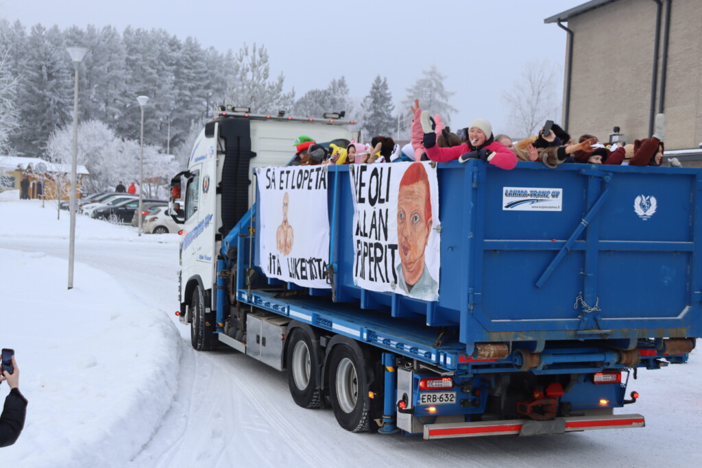 Urjalalaisiin penkkariperinteisiin kuuluu tapa kantaa abit ulos koulusta. Niin tänäkin vuonna. Pihalle häädetyt koulunsa päättävät siirtyivät sujuvasti kuorma-auton lavalle ja edelleen penkkariajelulle torvet soiden.