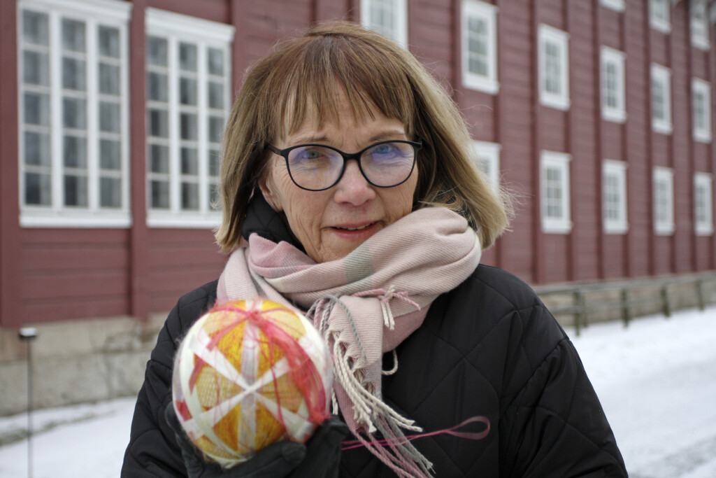 laskee Nuutajärven lasikylän ravintolan ovaalipöydälle pehmeän, suuren appelsiinin kokoisen pallon…
