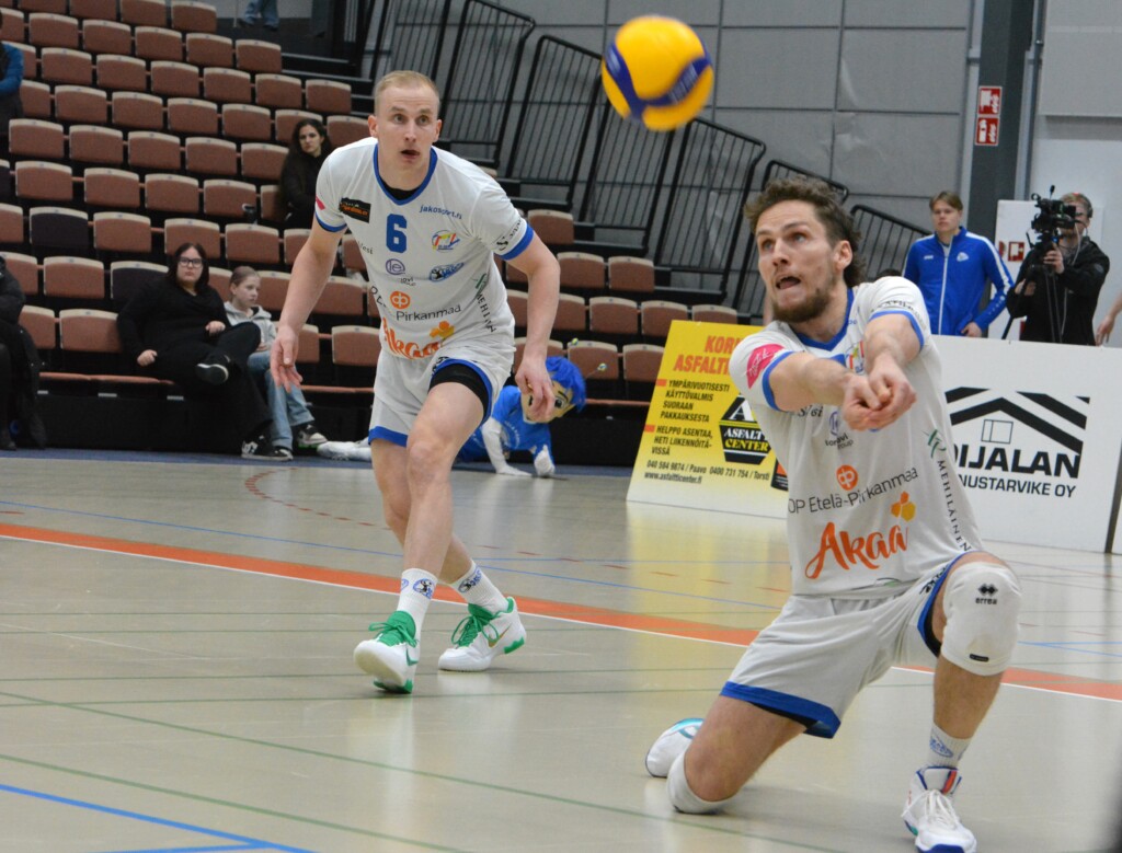 Kokeneet Niklas Seppänen (6) ja Sakari Mäkinen ovat Akaa-Volleyn avainpelaajia Mestaruusliigan lauantaina alkavissa pudotuspeleissä.